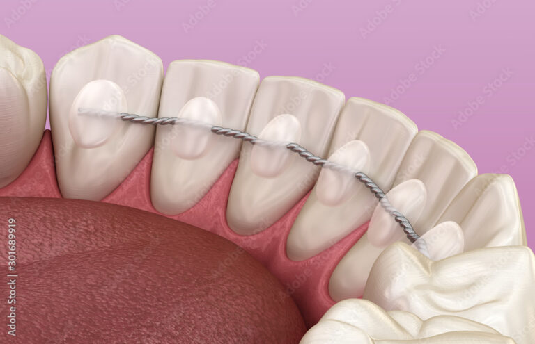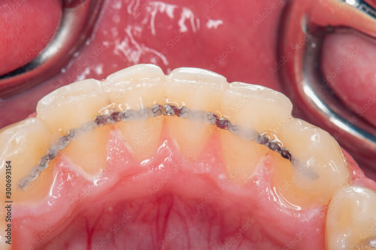 Es handelt sich um einen dünnen Draht, der zur zusätzlichen Retention auf die Innenseite der Ober- bzw. Unterkieferfrontzähne geklebt wird. Er ist somit praktisch unsichtbar und kann einige Jahre im Mund belassen werden. Wenn sich eine Klebstelle lösen sollte, werden die Patient:innen angewiesen, sofort für eine Reparatur in die Ordination zu kommen.