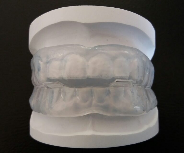 Die Tiefziehschiene besteht aus einem durchsichtigen Material und ist somit für das Umfeld kaum sichtbar. Sie stabilisiert die Position der Zähne und wird ausschließlich in der Nacht getragen. Durch exakte Passform hat die Patient:in ein exzellentes Instrument zur Hand, um kleinste Veränderungen mittels Schiene sofort feststellen zu können. Kleine Verschiebungen der Zähne können auch mit der Schiene rückgängig gemacht werden.