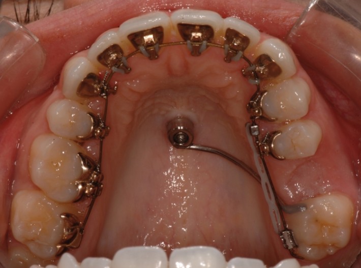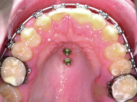 Im vorliegenden Fall hilft ein Gaumenimplantat mit einer entsprechenden Apparatur die Mahlzähne nach hinten (distal) zu bewegen, um eine korrekte Verzahnung einzustellen oder einen Engstand ohne Extraktion und ohne abnehmbare Geräte (z.B. Headgear) aufzulösen.